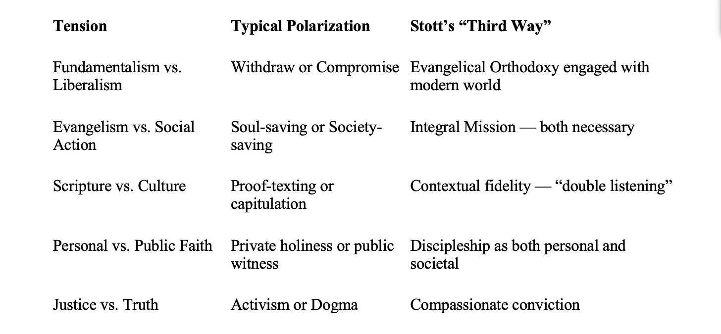I cannot remember the first time I heard the phrase “Third-way ism.” In evangelicalism, it refers to a philosophy of holding to biblical tensions, forgoing the natural tendency to collapse into simplistic binaries. John Stott never used the term “Third Way-ism”, but he often employed such an approach. He was fond of pitting two extremes against one another while proffering a preferred middle ground. For example, in The Contemporary Christian, Stott writes that believers should use “double listening” – listening simultaneously to both God’s Word and the modern world (he made sure to qualify: the latter should be evaluated in deference to the former). This fits within Stott’s larger missiological framework rejecting both isolationism (a fundamentalist withdraw) as well as accommodationism (a liberal surrender). He writes, “We are neither to withdraw from the world nor to become indistinguishable from it, but to serve it with the mind of Christ.” This is Stott’s Third Way-ism in action – engagement without capitulation, faithfulness without fear.